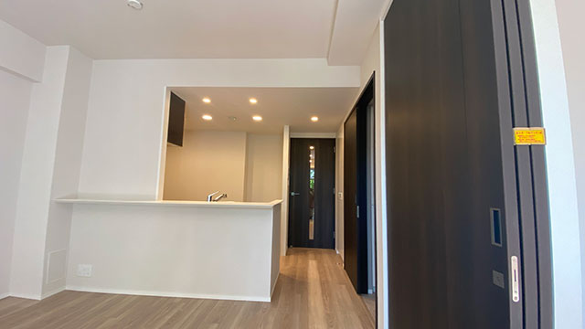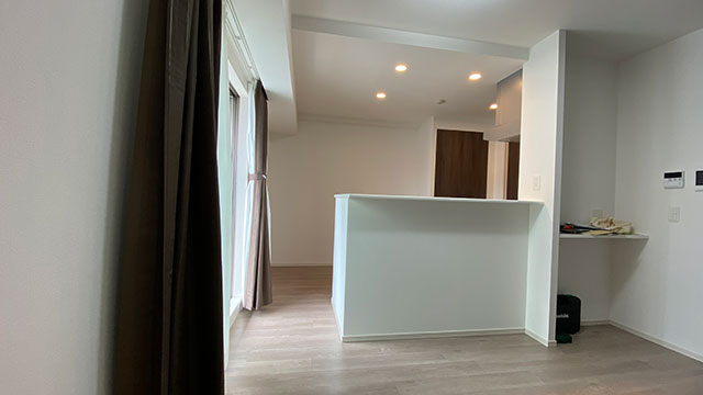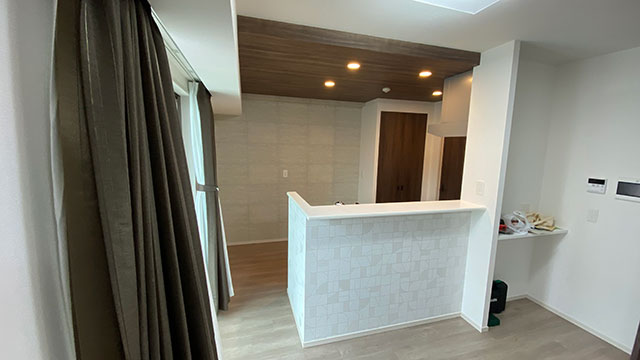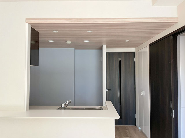 リビング側から見たときにキッチンの天井は下がっていますが、キッチンカウンターの上部壁と天井が一体化しています。