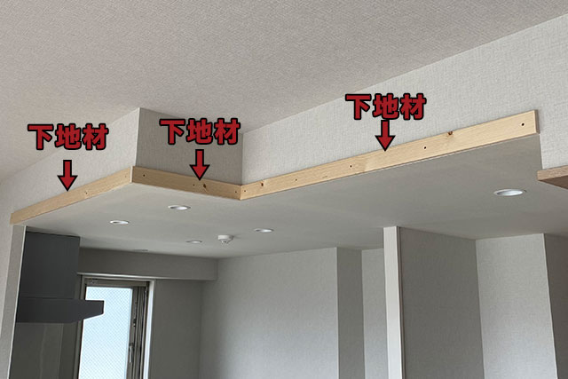 このように互い違いで直線になっていない天井でも下地材を付けて下がり天井風に仕上げることも可能です。