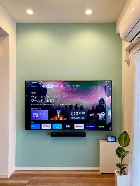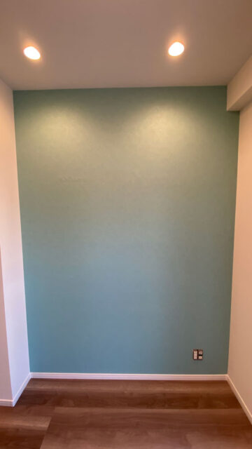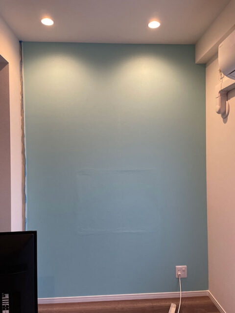 それは今流行りの「壁掛けテレビ」を実現するために壁内側に補強をして壁紙を映えるアクセントクロスに張替えを試みた結果、思っていたのとは違う結果になってしまったという事です。