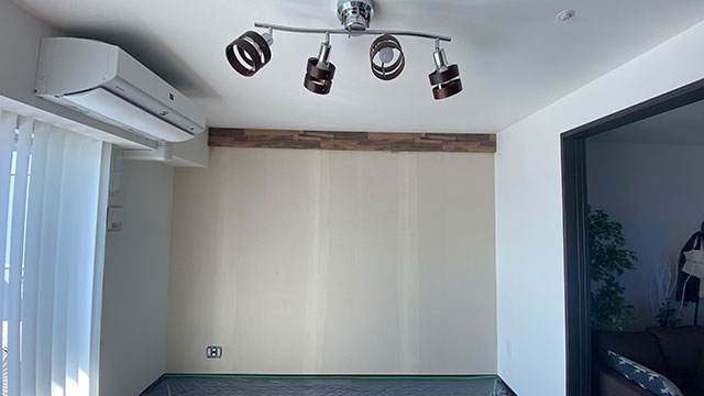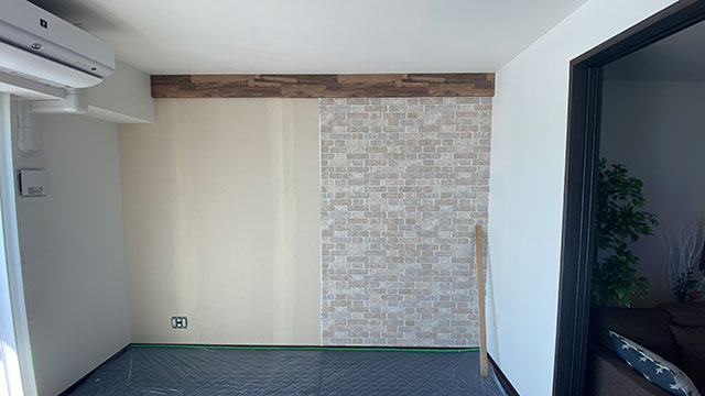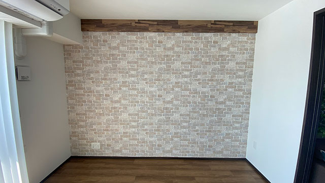 梁部分は張替えをされないケースが多いのですが、今回ご依頼いただいたお客様は梁の部分と壁面を木目調とレンガ調という違う柄を合わせてエレガントでスタイリッシュな雰囲気を演出しています。