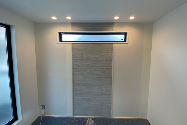 今回ご依頼頂いたリビング壁面を大判タイル柄のアクセントクロスに張り替えるのあたり印象的な窓を意識して壁紙の割付を計算しました。