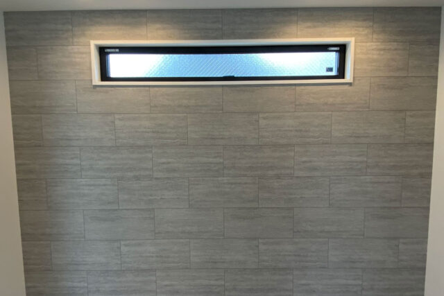 本壁紙は同調プリントと呼ばれる製法で目地の凸凹がリアルに表現されているため、窓を意識して割付をすることでバランスがとれた仕上がりになりました。