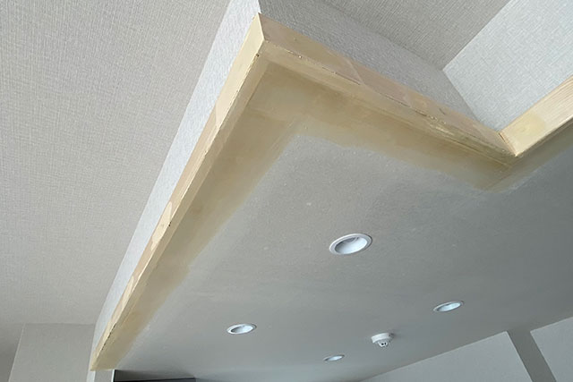 このような天井の場合にそのまま天井部分を張り替えますと見切りになる部分が無く大切な立体感がありませんので、収まりがよく立体感を演出するための下地材を付けていきます。