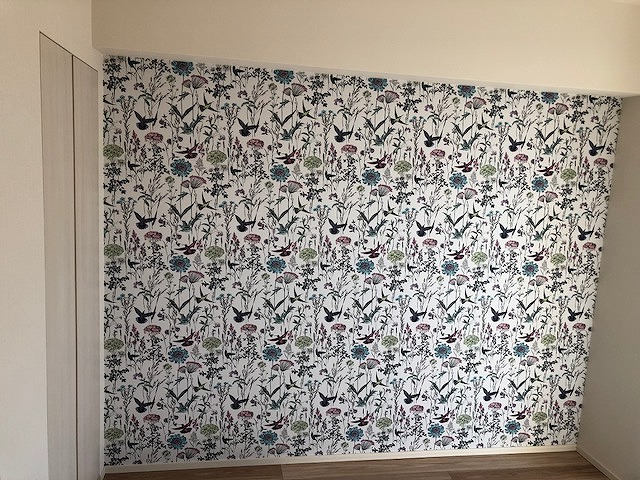 アクセント壁紙で、このような絵が描いてあるデザインはなかなか斬新な感じでお客様自身も大変喜んでいました。