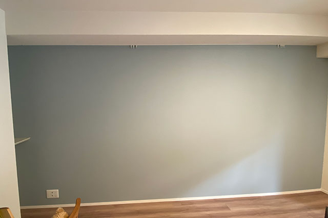 ナチュラル家具が揃っているリビングのテレビ背面をブルーグレー壁紙に張替えをしました。
