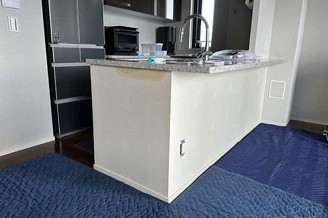 本壁紙には消臭や防水、防カビ、抗菌機能などキッチン部分には嬉しい様々な機能がありますが、表面強化機能も付いていますので、ついつい足などでコツンとした時でも傷がつきにくい仕様になっています。