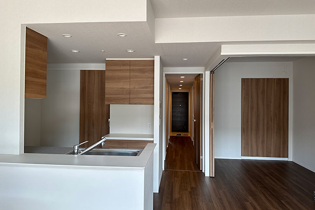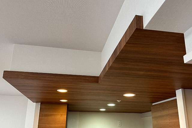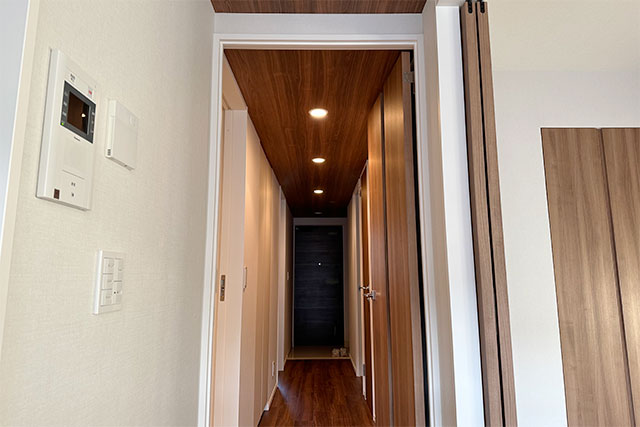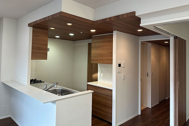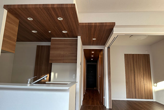本事例はキッチンの天井を下がり天井風に張替えて扉から続く廊下の天井も同じ木目調のクロロスに張替えをさせて頂きました。