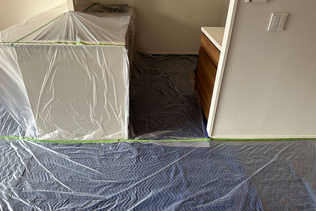 キッチン天井を張り替える場合には通常の壁一面張替えに比べて徹底した養生を時間をかけて行います。
