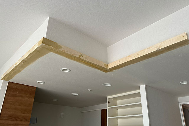 天井部分の壁紙を丁寧に剥がしたら下がり天井風にするための下地材を取り付けます。