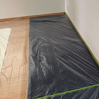 養生用毛布の上にビニール養生を更にして巾木にしっかりと止めます。